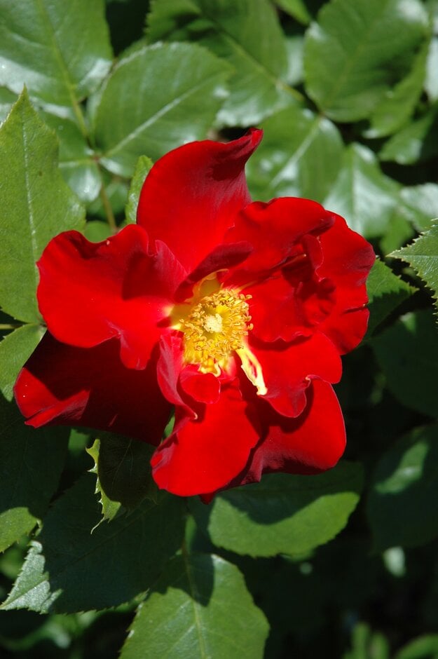Dense, upright rose about 1.2m tall, with glossy, rounded dark green leaves. Clusters of fragrant, single, bright crimson-red blooms, with pronounced yellow stamens, repeat-flower through summer and if not deadheaded will produce small orange-red fruits (hips) during autumn