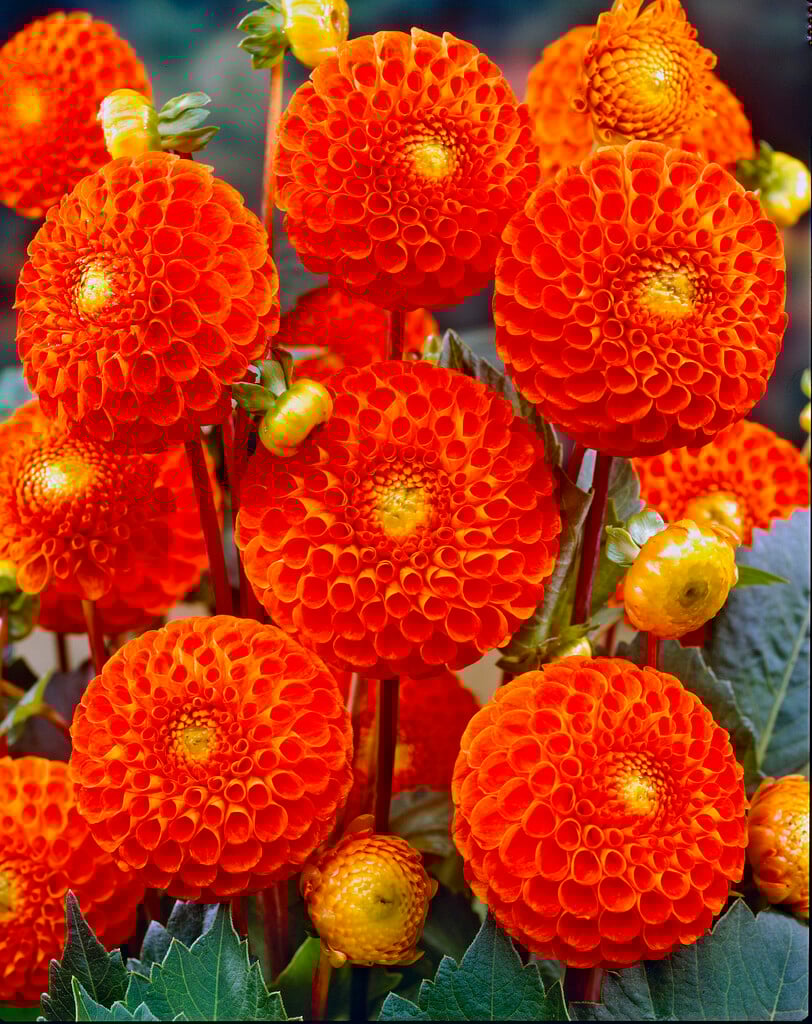 A tuberous-rooted perennial to 90cm, with mid-green foliage, flowering from mid-summer until the first frost. The blooms are small pompons, 6cm across, with many neat rows of tightly inrolled, yellow-orange petals