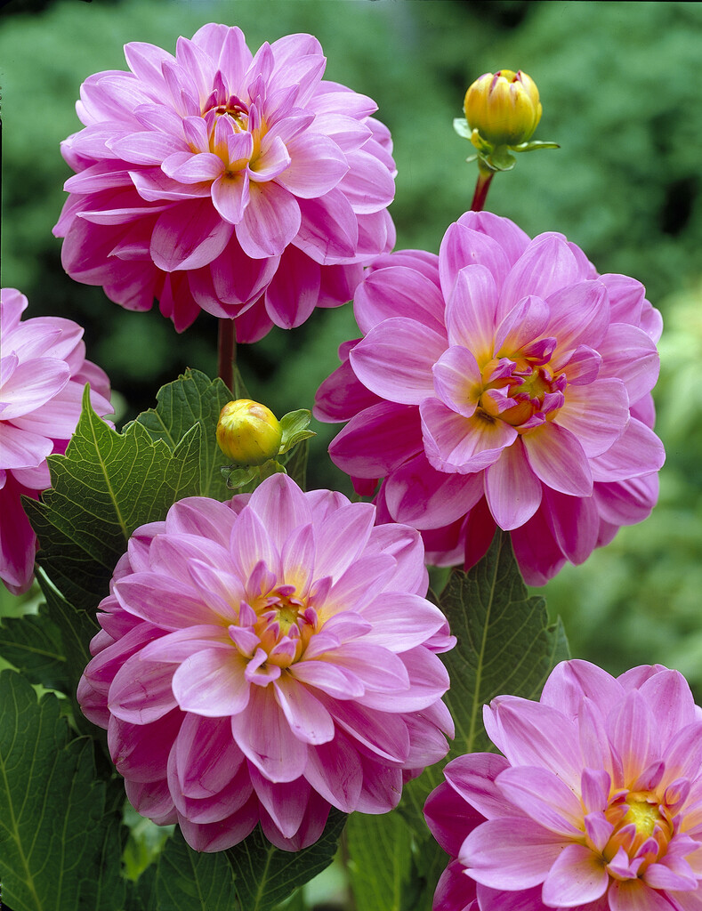 Dahlia are tuberous rooted perennials with pinnately divided leaves and showy flowerheads, double in many cultivars, in summer and autumn