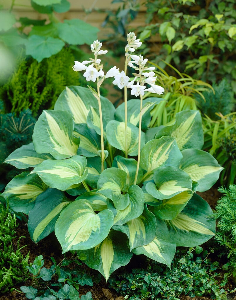 A vigorous clump-forming deciduous perennial to 75cm high, with thick, rounded blue-green leaves with narrow yellow streaks in the centre. Leaves are deeply veined and textured. Produces funnel-shaped, pure white flowers on upright stems in summer