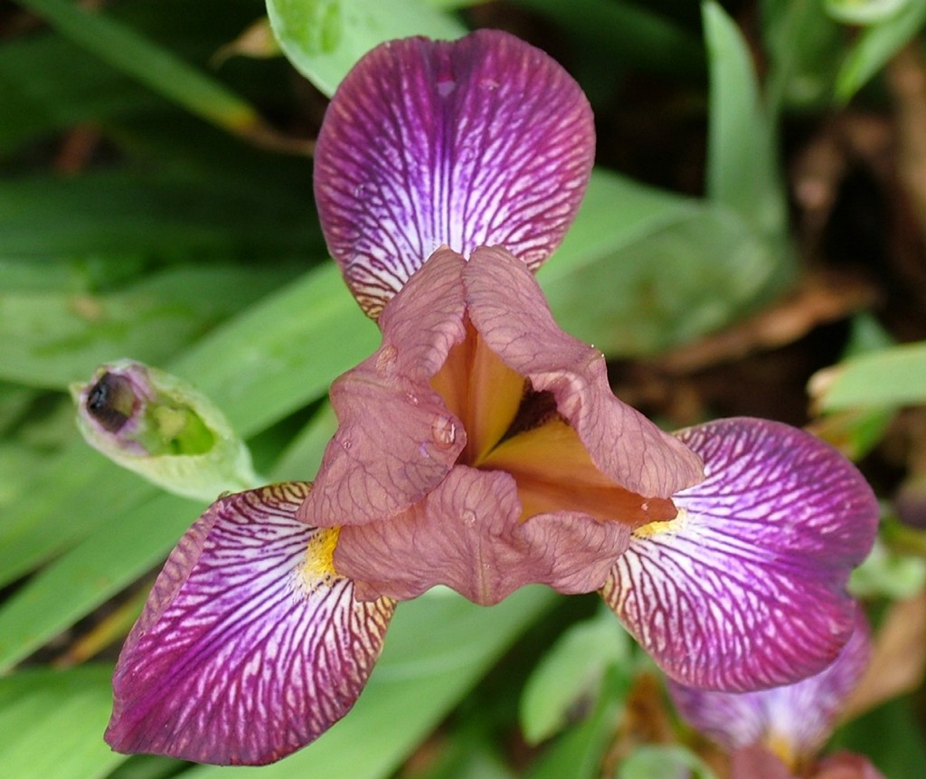 A compact plant with erect, glaucous foliage and straight flower stems to 55cm with usually 4 small, shapely flowers. Standards are cupped, lightly wrinkled, yellow-flushed coffee. Falls are held horizontally, heavily maroon and red-purple veined on a cream background. Beards yellow-orange, conspicuous. Early-mid season. Distinctive colouring and very floriferous, may rebloom even in late autumn