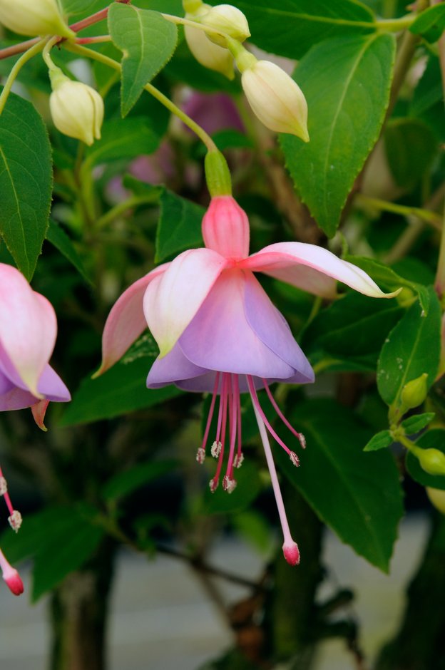 Fuchsia can be deciduous or evergreen shrubs or trees, rarely perennials, with opposite or whorled leaves and usually pendent flowers with conspicuous tubular calyx, 4 spreading sepals and 4 erect petals