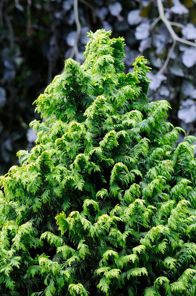 Chamaecyparis are evergreen trees, usually of narrowly ovoid or columnar outline, with much-branched sprays of small scale-like leaves, and small, globose cones; tiny red male cones are conspicuous in a few cultivars