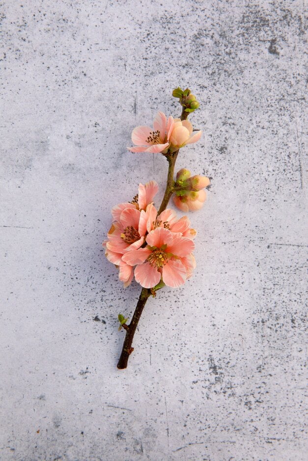 A vigorous upright, deciduous shrub about 1.5m tall, with spiny stems and glossy dark green leaves. Single, salmon-pink flowers edged and splashed white with pale yellow anthers, appear in mid-spring, followed by large yellow-green fruits. These can be used to make jams and jellies but please see notes on toxicity for further advice