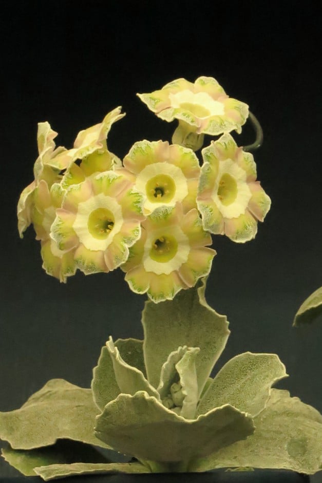 Show Auricula group primulas have a distinct pure white circle in the centre of each flower. They can be single-coloured, edged with black feathering out to the margins, or fancy (edged with coloured feathering).
