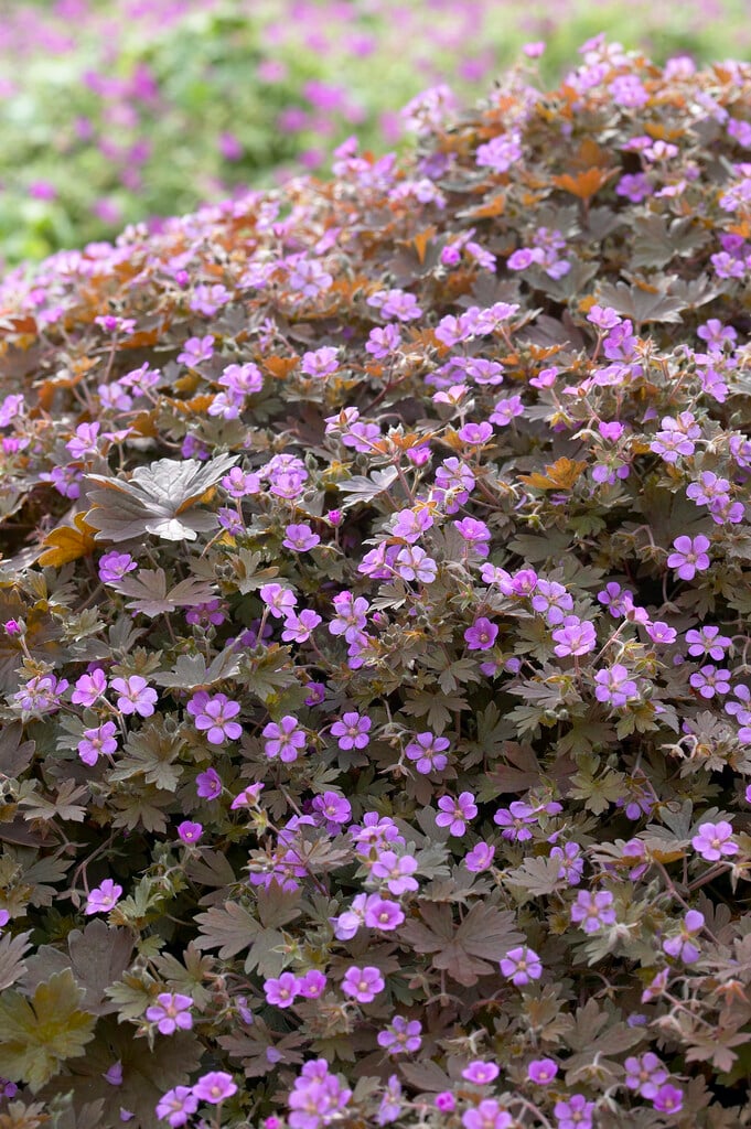 A low-growing, clump-forming herbaceous perennial with deeply lobed bronze-purple leaves. From spring to early autumn, it produces an abundance of small pink flowers. Older leaves and autumn leaves often turn red.