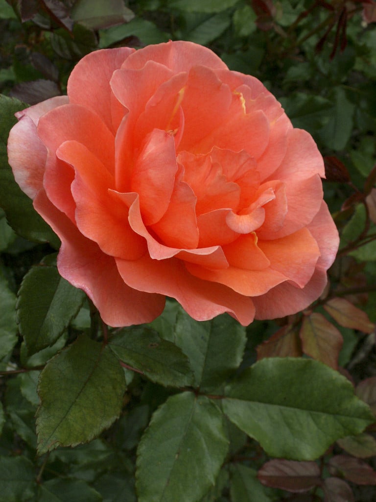 A deciduous upright rose, to around 1.1m tall, with dark green, divided leaves and flushes of fragrant, salmon-orange blooms borne singly or in small clusters from summer into autumn