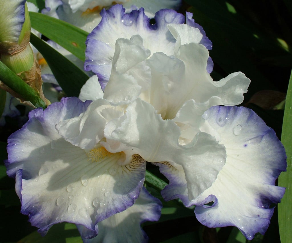 A spreading, vigorous plant with semi-erect glaucous leaves to 65cm tall, and flower stems to around 85cm, usually with up to 8 flowers. Flowers are ruffled, the standards white, the falls white with a blue margin. Beards orange. Mid to late season