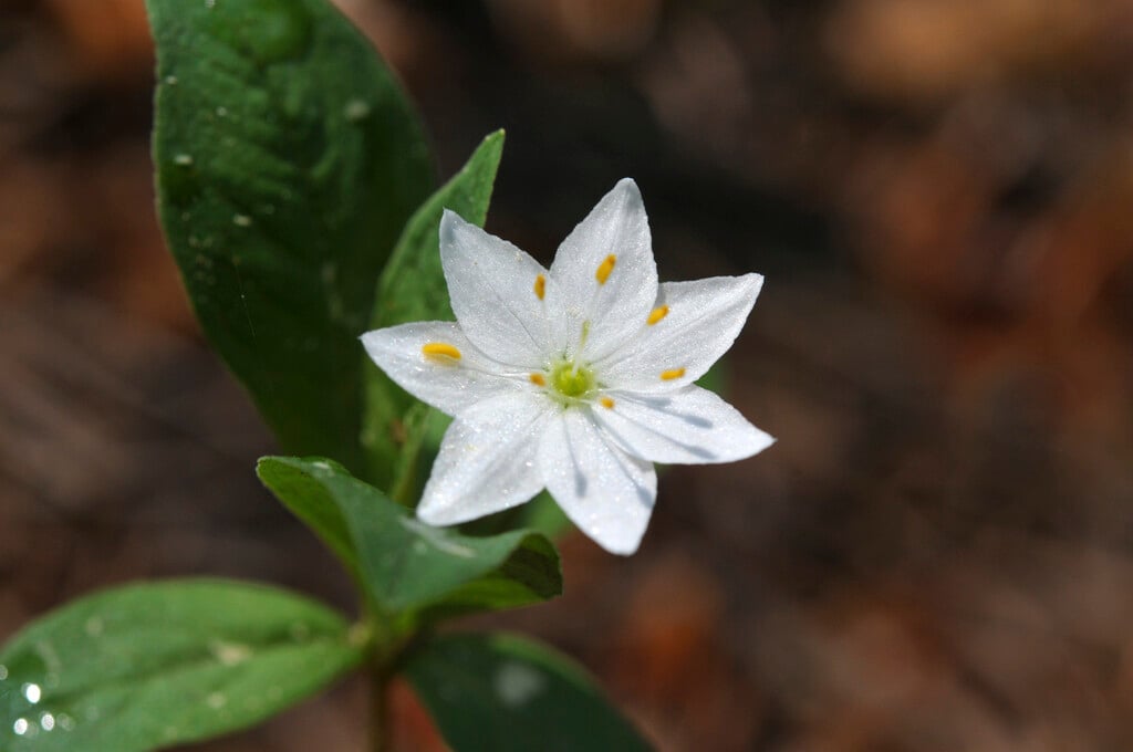 A perennial woodland wildflower found mostly in Scotland and a few sites in northern England. Slowly spreading rhizomes support upright stems to about 20cm, topped by a whorl of oval, evergreen leaves. Above these. one to three white, cup-shaped flowers with pointed petals develop on fine stems in summer