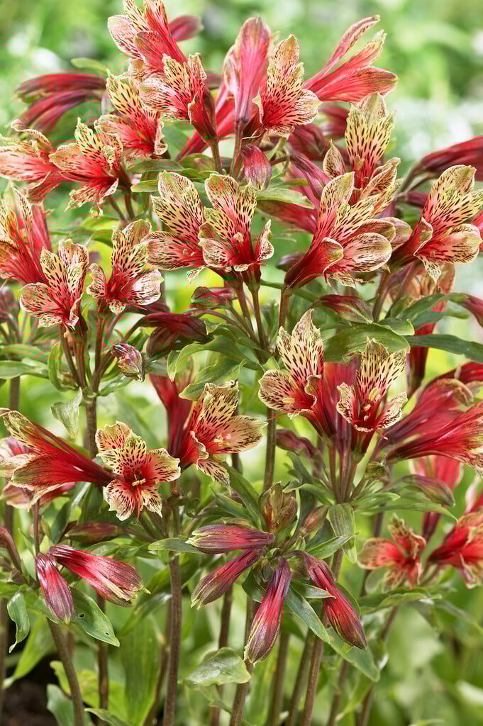 Alstroemeria are fleshy rooted herbaceous perennials forming spreading clumps of erect stems bearing narrowly lance-shaped leaves, with umbels of showy funnel-shaped flowers in summer