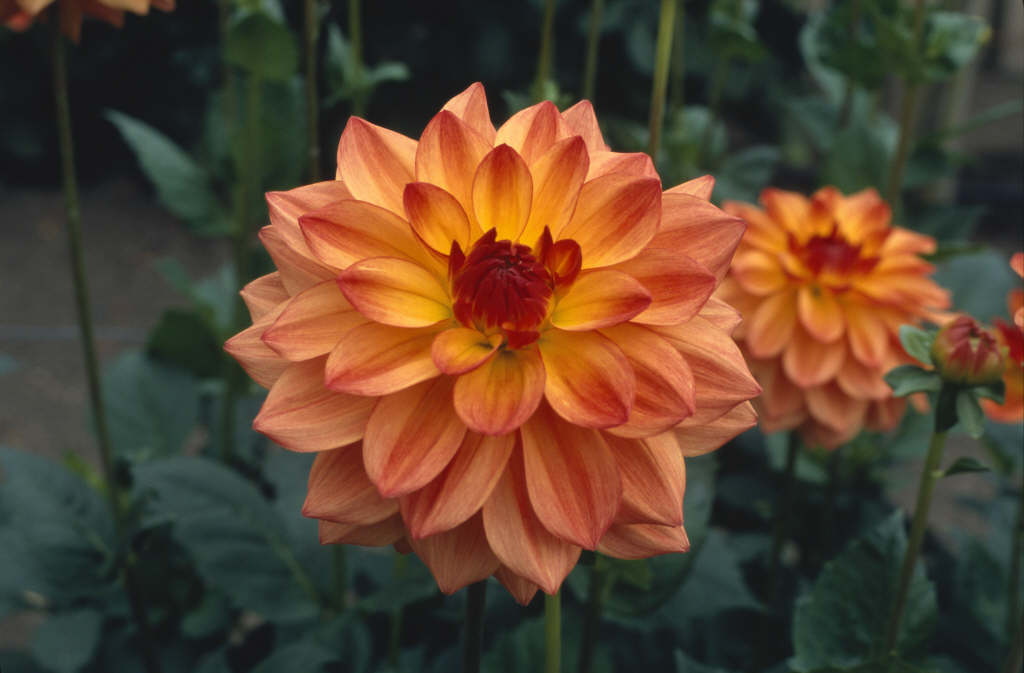 Dahlia are tuberous rooted perennials with pinnately divided leaves and showy flowerheads, double in many cultivars, in summer and autumn