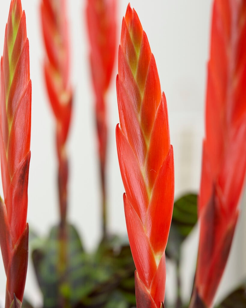 Vriesea are evergreen epiphytic perennials forming rosettes of strap-shaped, often attractively marbled leaves, with erect spikes of flowers with showy bracts in summer or autumn