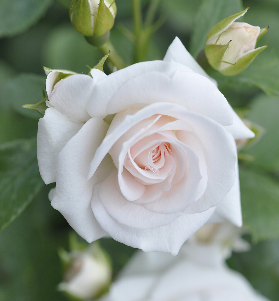 A short, bushy rose to 80cm tall, with glossy, mid-green foliage, and clusters of lightly-scented, well-shaped pale blush-pink blooms repeat-flowering through summer and autumn