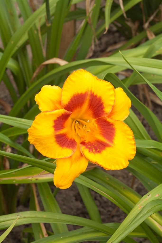 A deciduous, clump-forming perennial with strap-like leaves to 60cm high, producing branching stems of rounded, bright yellow flowers with deep red eyes and ruffled edges, from early to midsummer. This is an extended blooming cultivar, each flower can last for up to 24 hours