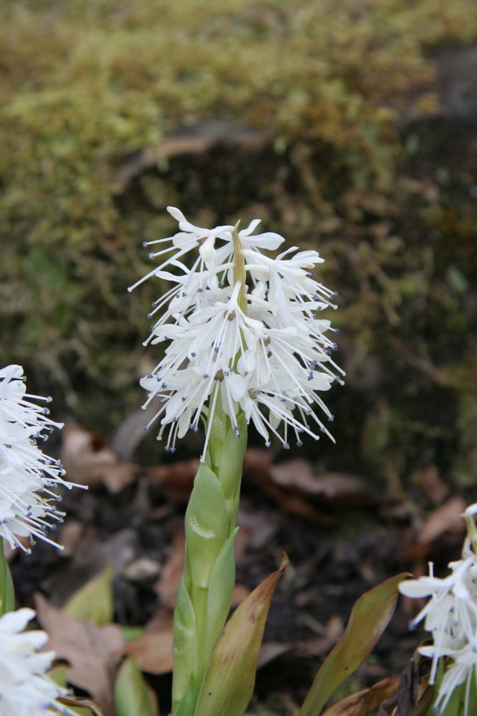 an evergreen perennial to about 30cm with strap-shaped leaves turning bronzy in winter. The fragrant flowers, which appear in short spikes from late winter to late spring, are white, ageing to pink, tubular with long petal lobes and even longer stamens with blue anthers