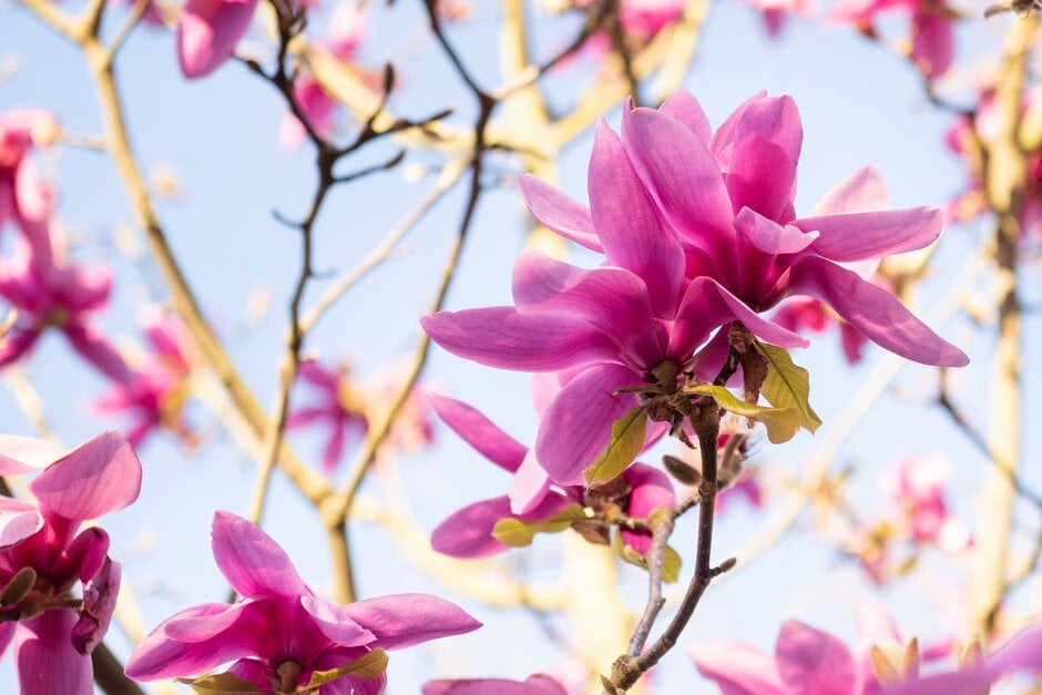 Magnolia can be deciduous or evergreen trees or shrubs, with large, showy, often fragrant flowers, often opening before the leaves, and sometimes followed by colourful cone-like fruit
