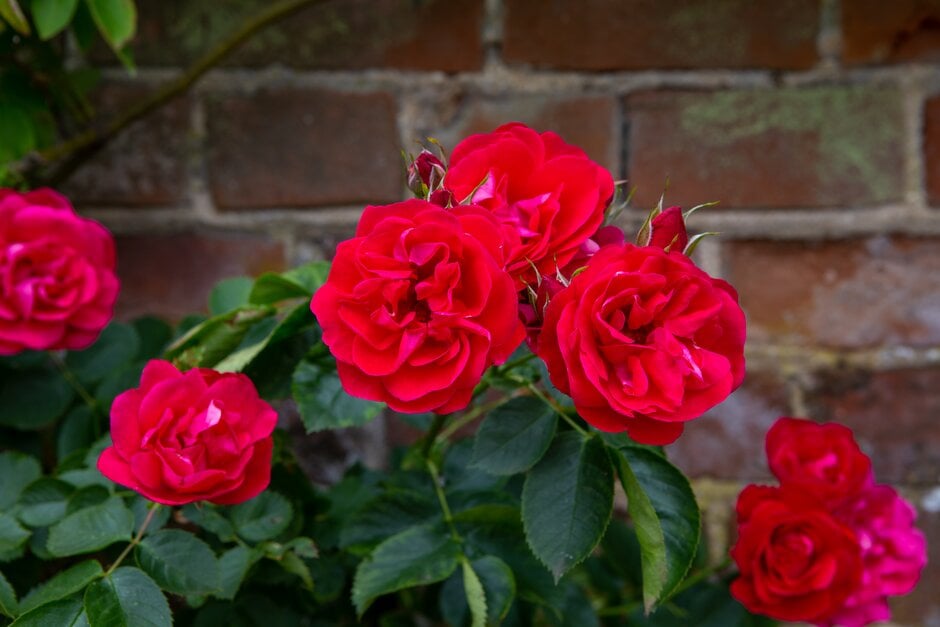 Rosa can be deciduous or semi-evergreen shrubs or scrambling climbers, with usually thorny stems bearing compound pinnate leaves and solitary or clustered flowers. Flowers may be followed by showy red or purple fruits in some varieties.