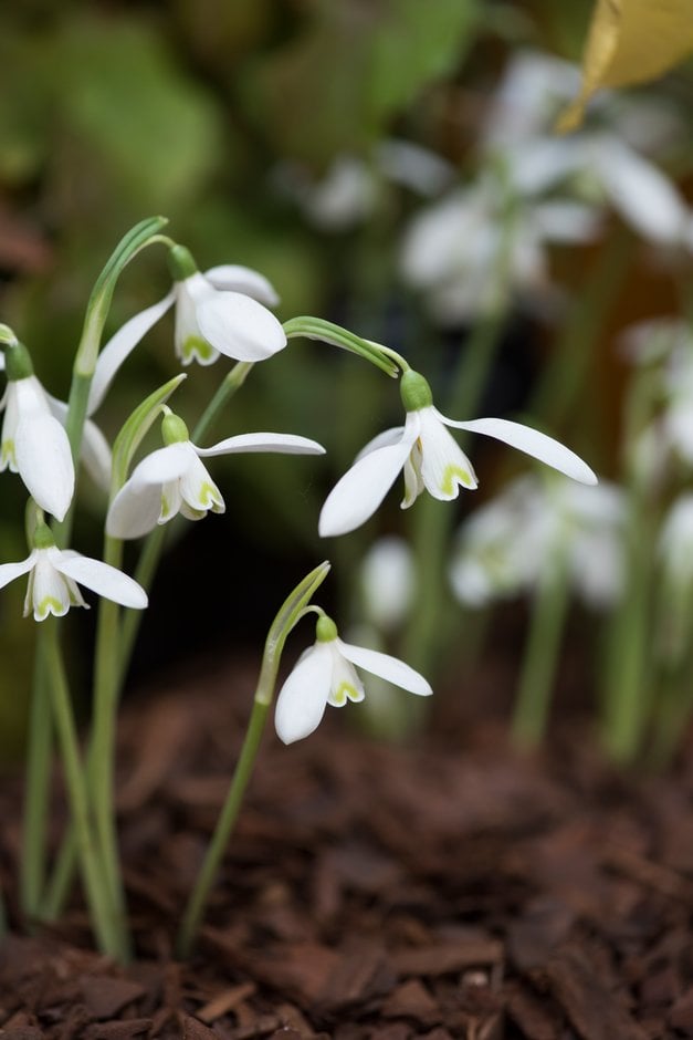 Galanthus are dwarf bulbous perennials with linear or strap-shaped leaves, and solitary, often honey-scented, nodding flowers with 3 white outer tepals and 3 smaller inner ones often marked with green