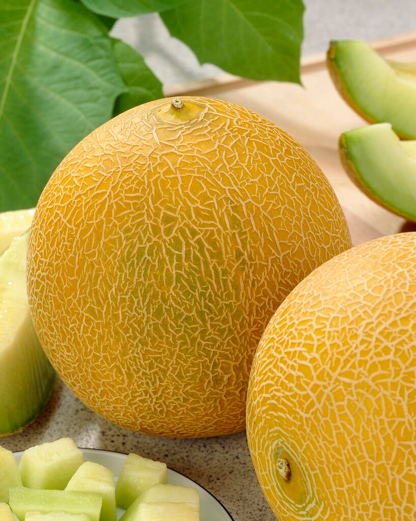 A vigorous greenhouse melon cultivar producing round, yellow fruit with attractive ‘netting’ and sweet, pale green to creamy white flesh. Shows resistance to powdery mildews