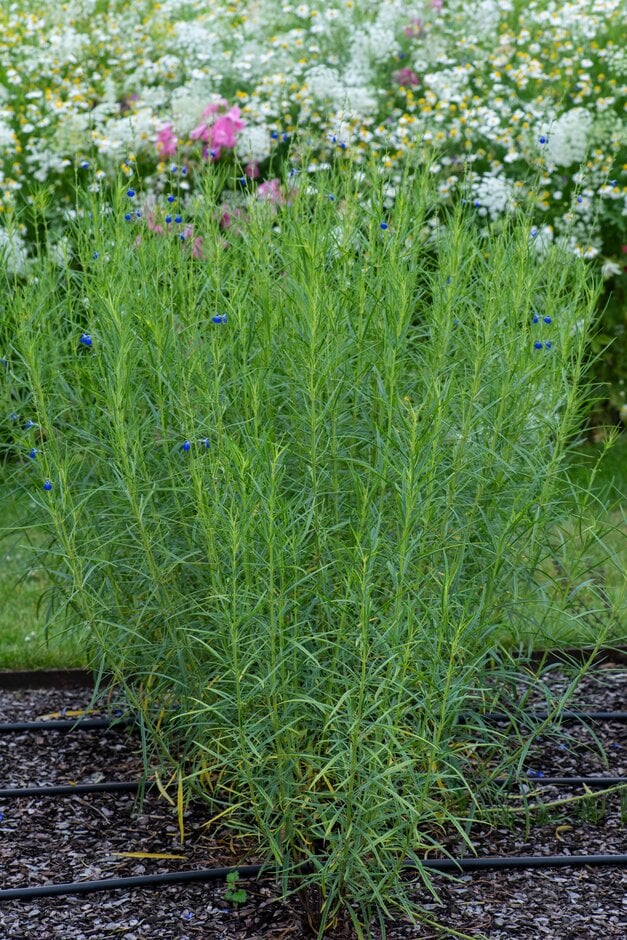 A deciduous to semi-evergreen herbaceous perennial to around 100cm in height, with a more upright and sturdier habit than other forms. Narrow, green needle-like foliage covers thin, wispy stems and intensely bright blue flowers appear from September through to November. Drought-tolerant and frost-hardy in most parts of the UK