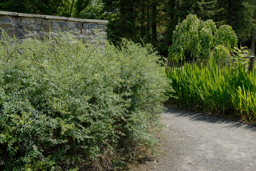 A graceful deciduous shrub much wider than it is tall. It has small linear leaves of bluish green. Flowers in summer, grow in pairs and are lilac-ink and fragrant, developing into dark red berries