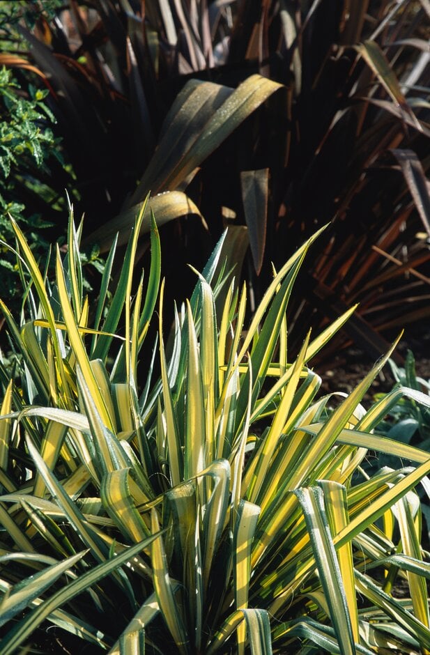 A clump-forming, evergreen shrub to around 1m tall, forming stemless, sword-shaped, variegated creamy golden-yellow leaves with bright green edges. Panicles of nodding, creamy-white, bell-shaped flowers may be produced in late summer. Drought tolerant once established