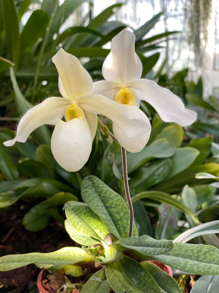 Grow in terrestrial, bark based orchid mix, with added sphagnum moss and perlite, or crushed limestone chips. In summer, provide higher humidity and bright, filtered light. Average summer temperatures are between 20 - 25°C, with winter temperatures falling to 18 - 22°C. Apply fertiliser with every third watering. Avoid heavy misting or overhead watering. As the plant lacks pseudobulbs, it shouldn't be left dry for long time. Water plant as it approaches dryness, but avoid standing in water, or keeping wet for prolonged period. See Paphiopedilum cultivation for more detailed advice.