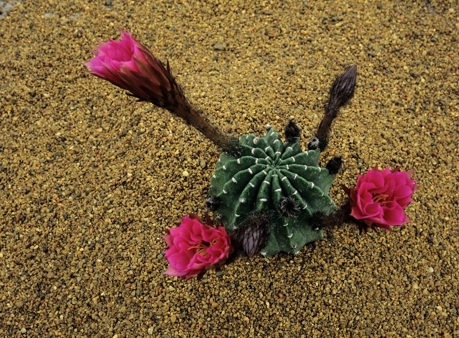 Echinopsis can have spherical or cylindrical, heavily ribbed and spiny stems, with funnel-shaped flowers in spring or summer