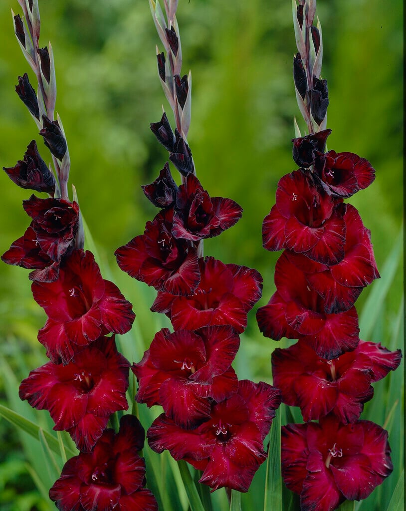 A large-flowered gladiolus, to around 100cm high, with green sword like leaves. Tall flower spikes produce large crimson-red, velvety flowers with an edge of deeper dark almost black bordering the bloom, dramatic blooms for the summer