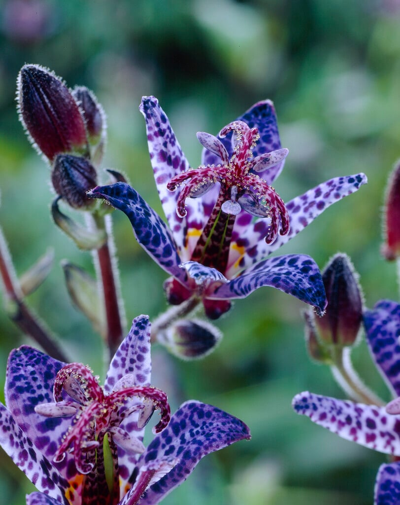 Tricyrtis are rhizomatous perennials, sometimes stoloniferous, with erect or arching stems with alternate, sometimes 2-ranked leaves and star-shaped or bell-shaped flowers that may be solitary or in terminal or axillary clusters