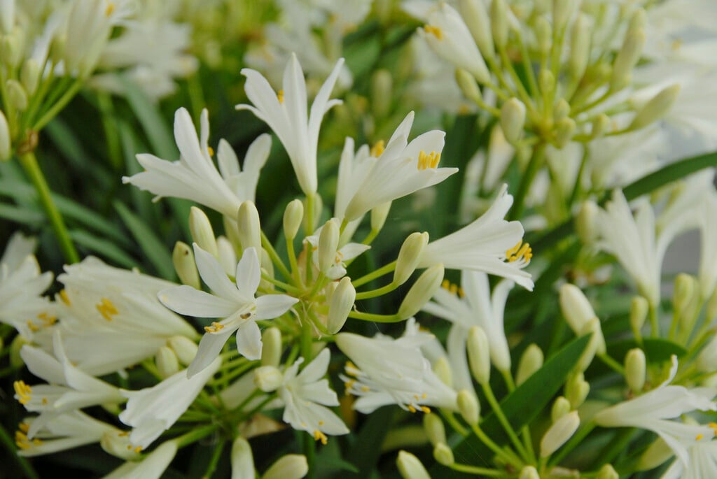 Agapanthus are clump-forming perennials with narrowly strap-shaped leaves, evergreen in some species, and erect stems bearing umbels of funnel-shaped blue or white flowers