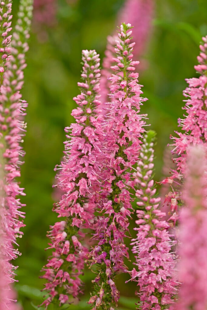A compact, clump-forming perennial to around 30cm high, with lance-shaped green leaves. Long spikes of small, star-shaped pink flowers are produced in early summer
