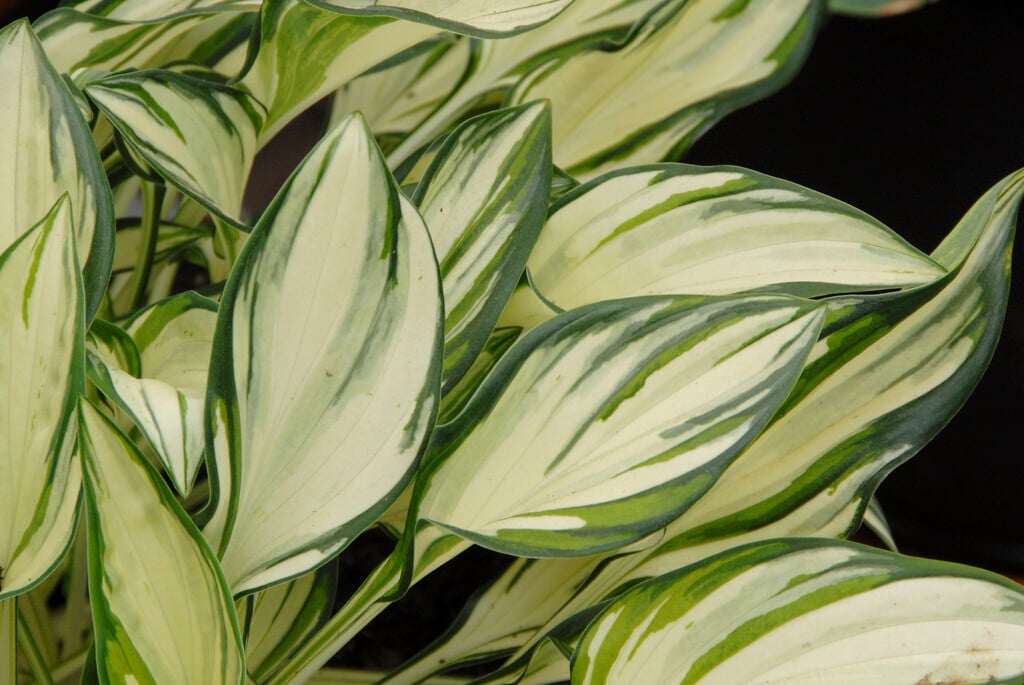 Hosta are clump-forming herbaceous perennials with simple, ovate or lance-shaped leaves, often attractively coloured or variegated, and erect racemes of nodding, funnel or bell-shaped flowers in early summer