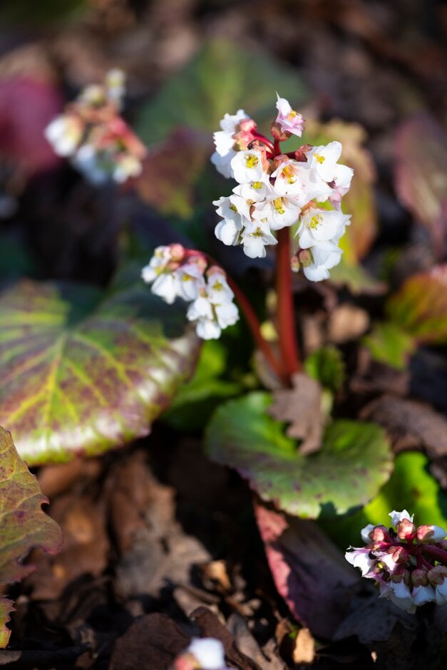 A compact yet vigorous evergreen perennial, producing clusters of white-pink flowers atop red-green stems, with oval, glossy, dark green leaves, tinged red-bronze in Autumn. Great for ground cover and Winter interest. Suitable for container growing