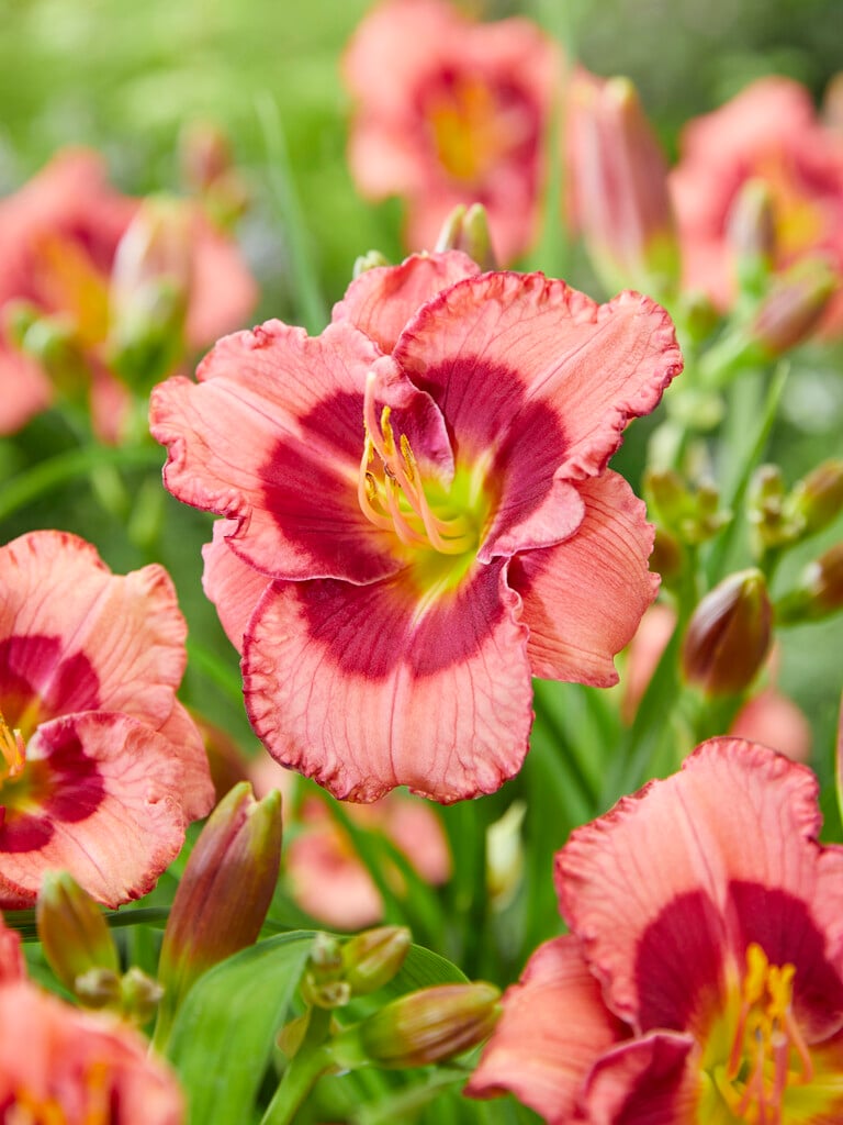 Hemerocallis may be evergreen or herbaceous perennials, with narrow, strap-shaped leaves and funnel-shaped flowers on erect stems in late spring or early summer