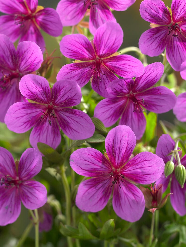 Geranium can be annuals, biennials and perennials, herbaceous or evergreen, with rounded, usually palmately lobed or divided leaves, and lax inflorescences of rounded, 5-petalled flowers