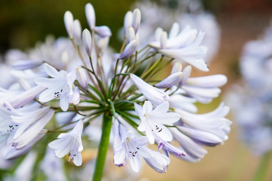 Agapanthus are clump-forming perennials with narrowly strap-shaped leaves, evergreen in some species, and erect stems bearing umbels of funnel-shaped blue or white flowers