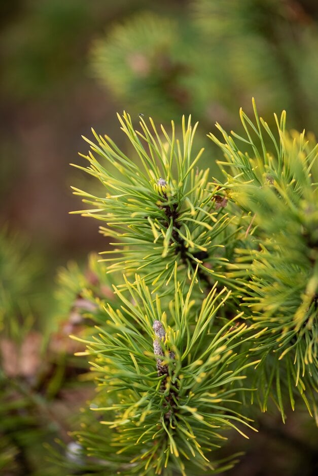Pinus can be shrubs or large, evergreen trees, some species with attractive bark, developing an irregular outline with age and bearing long needle-like leaves in bundles of 2, 3 or 5; conspicuous cones may fall or remain on the tree for years