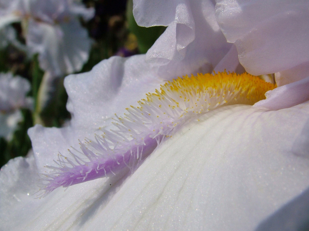 A tall iris, to around 105cm, with erect, glaucous foliage to 60cm. Flowers are ruffled, white tinged lavender, with orange-yellow beards. Scented; late season