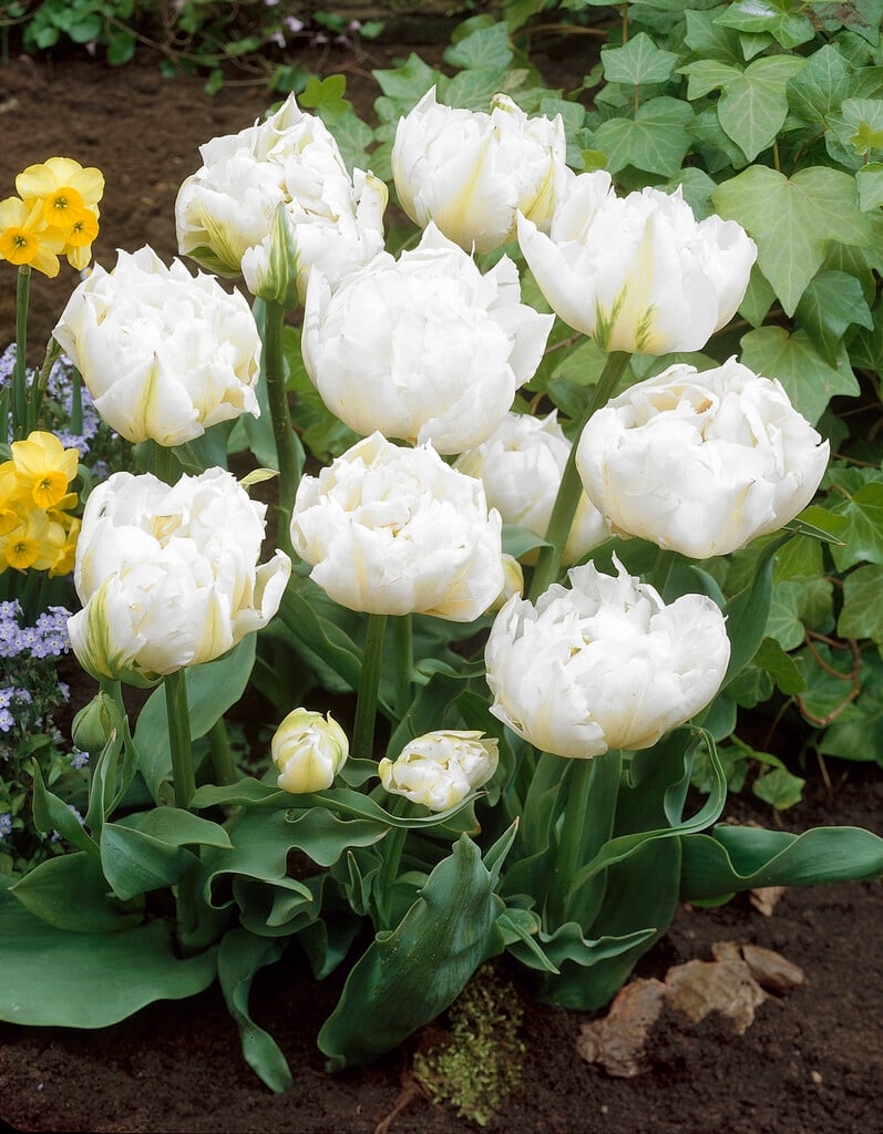 A perennial bulb with broadly lance-shaped green leaves. This tulip has double, pure white flowers, produced in mid-spring, and stands to around 25cm high