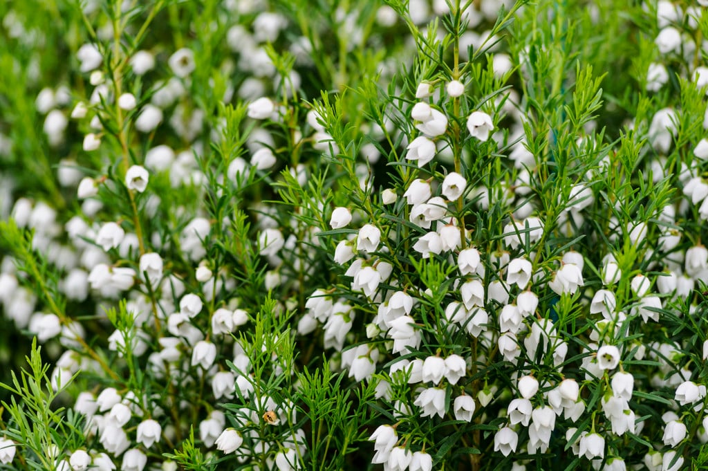 'Ice Charlotte' is an evergreen shrub with dark green, aromatic, needle-like leaves and small, white, scented, bell-shaped flowers in spring