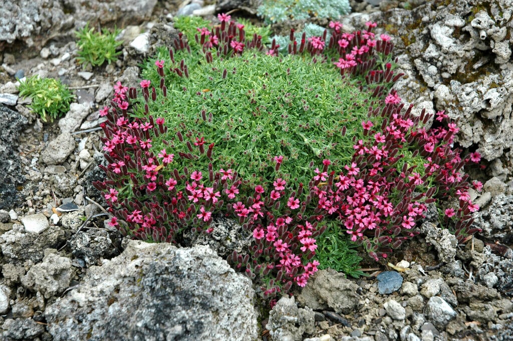 A very compact, rhizomatous alpine perennial to around only 5cm in height, forming a cushion of small, thin, almost pine-needle shaped dark green foliage. Clusters of crimson-red to pale purple, rarely white flowers appear on the tips of the stems from late summer well into autumn