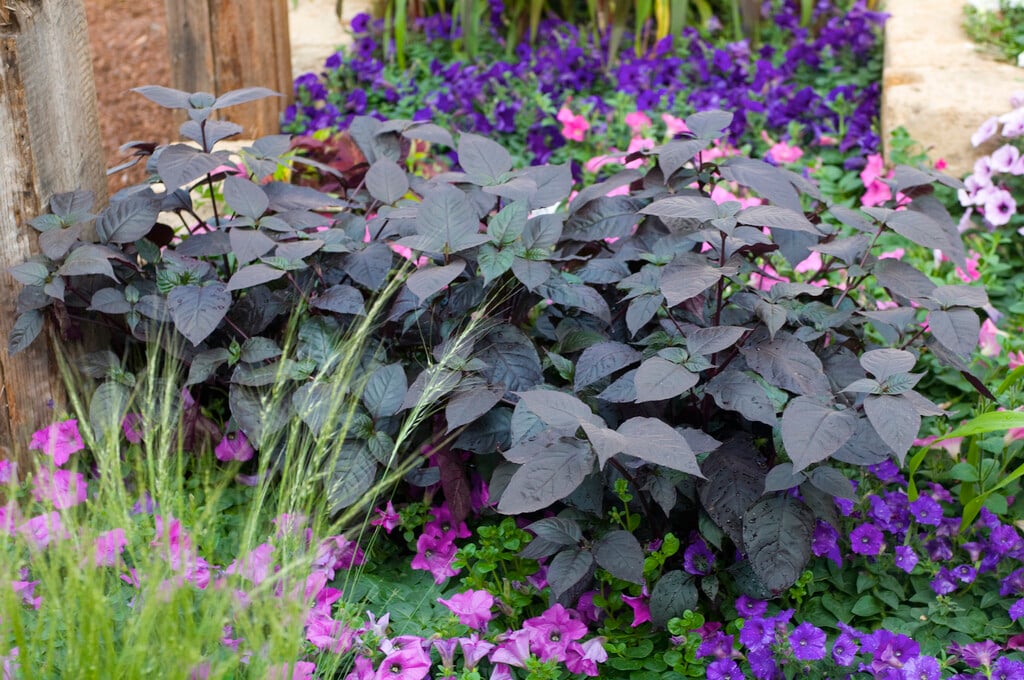 A vigorous, spreading upright tender evergreen perennial grown as an annual for the dark purple stems and foliage. Leaves are lance shaped and flowers are occasional, white and insignificant, in summer.