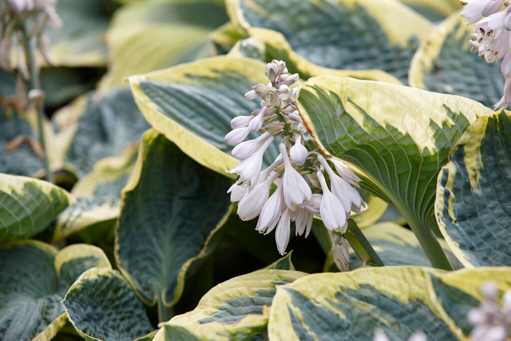Hosta are clump-forming herbaceous perennials with simple, ovate or lance-shaped leaves, often attractively coloured or variegated, and erect racemes of nodding, funnel or bell-shaped flowers in early summer