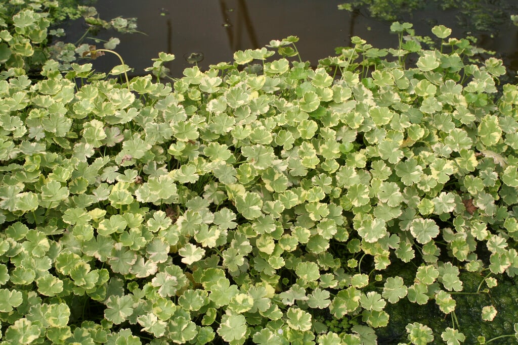 An aquatic or marginal, low-growing perennial forming a mat of small, variegated, kidney-shaped to rounded leaves with shallow lobes that are green with creamy-white margins. Tiny, inconspicuous, greenish flowers may be borne in small clusters from late spring into summer