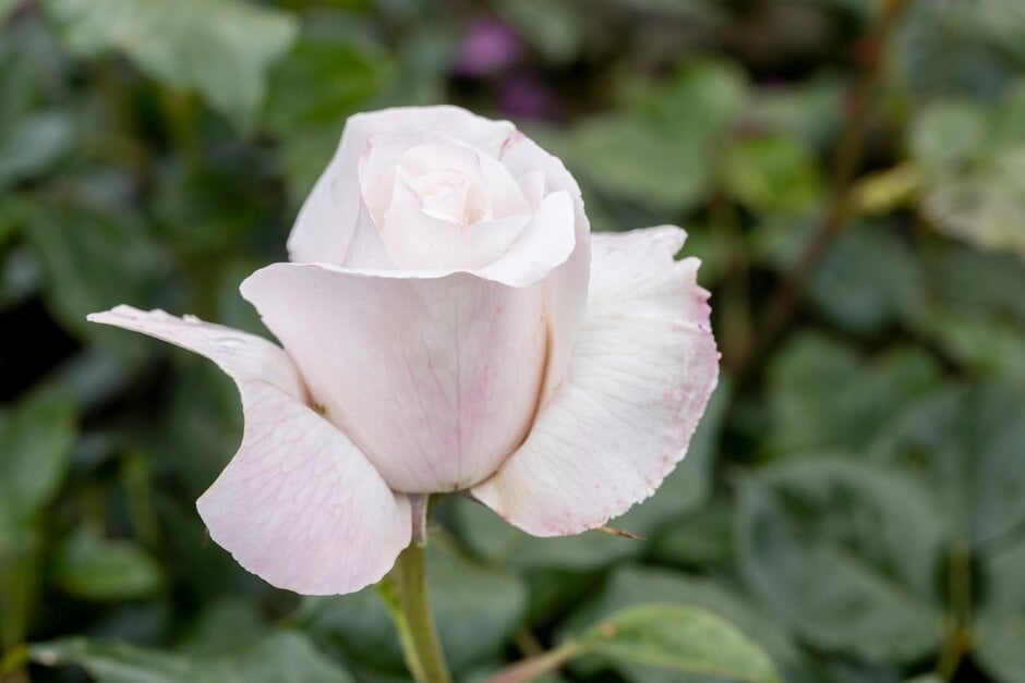 Bushy, upright hybrid tea rose to 1m high or more, with healthy, glossy, dark green leaves, tinted red when young. High-centred, shapely creamy-white blooms, tinted palest pink, are very fragrant and produced almost continuously during summer and into autumn
