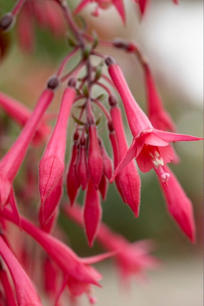 Fuchsia can be deciduous or evergreen shrubs or trees, rarely perennials, with opposite or whorled leaves and usually pendent flowers with conspicuous tubular calyx, 4 spreading sepals and 4 erect petals
