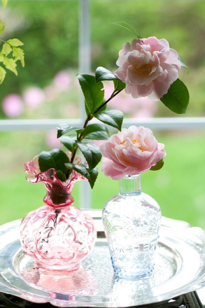 Camellia are evergreen shrubs with simple, ovate, glossy, leathery leaves and showy flowers with solitary or clustered flowers early in the year