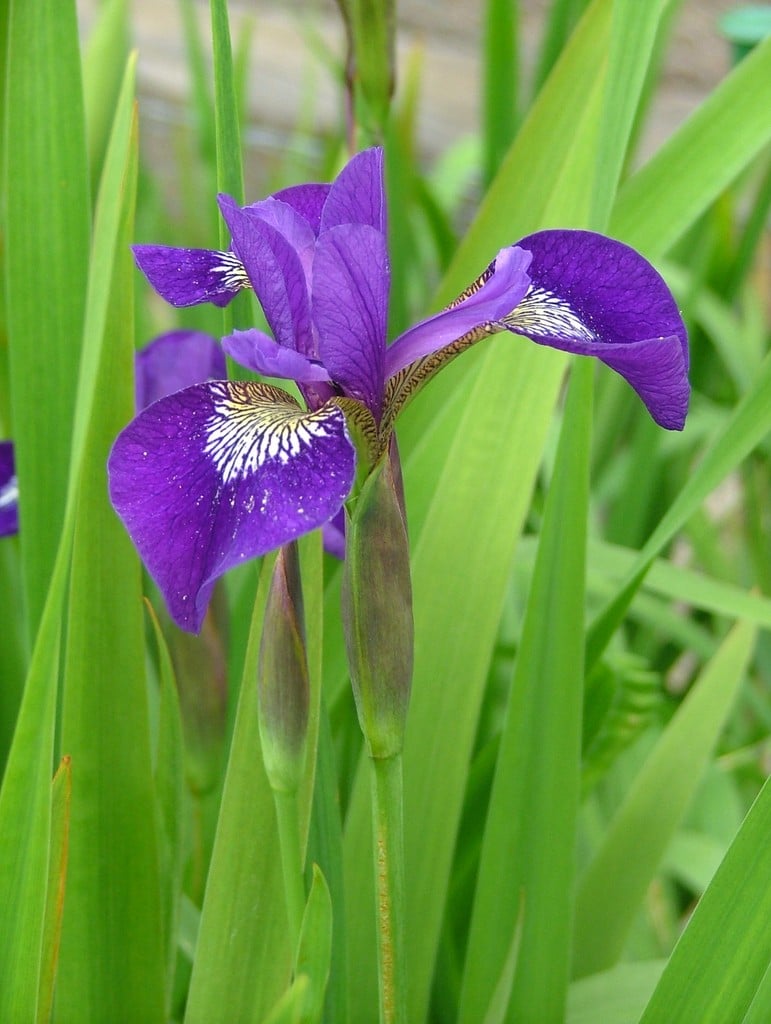A hybrid iris with some similarities to Siberian section irises. It is a vigorous, spreading plant with lax leaves to 105cm long, green with a red tint at the base. Flower stems are straight, erect, to 100cm, bearing up to 5 shapely, medium flowers. The violet standards are erect, cupped, the falls are drooping, violet, with a white, violet-veined signal flowering mid-summer