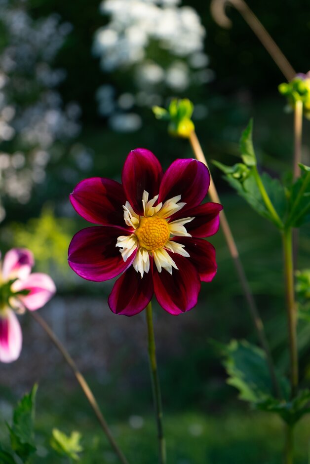 Dahlia are tuberous rooted perennials with pinnately divided leaves and showy flowerheads, double in many cultivars, in summer and autumn